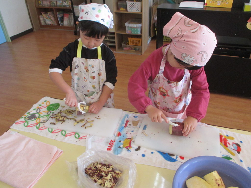 収穫したさつま芋を 年中さんが皮を剥き