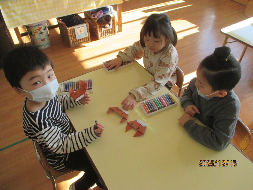 折り紙で馬の顔を折り、周りに絵を描いたり